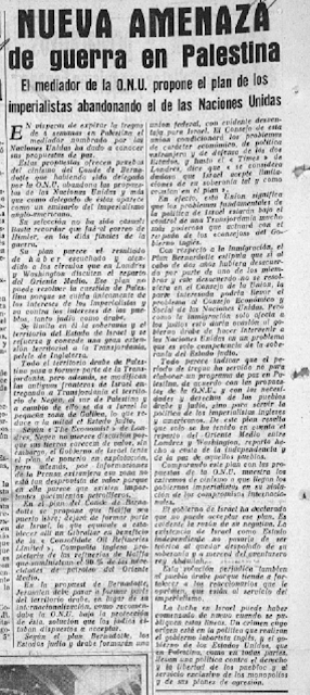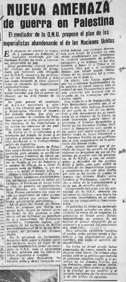 Todo parece indicar que o período de trégua serviu nom para elaborar um programa de paz para a Palestina, consoante as propostas da ONU e com as necessidades e direitos dos povos árabe e judeu, mas para servir a política dos imperialistas ingleses e americanos. Deste plano ressalta que apenas se teve em conta a repartiçom do Próximo Oriente entre Londres e Washington, divisom feita a custa da independência e da paz de aqueles povos.